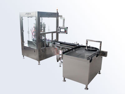 該生產線為U型回轉式布局,與直線式二元灌裝線為一個系列設備。該生產線亮點節省占地面積,適合化妝品,藥品GMP車間使用。采用全進口氣動元件,機器穩定性高。封口頭配備數顯壓力傳感器,達到預設定的壓力值才能完成封口動作,提高成品率,防止浪費。灌液頭安裝導向裝置加科學的密封設計,在注入液體時既保護二元的閥芯無損,且灌液無滴漏。液體定量系統采用臥式活塞缸加緩沖儲罐設計,灌裝速度快、精度高。整機裝有安全防護罩,可實現開門停機,一鍵控制,保障操作工人的安全。
